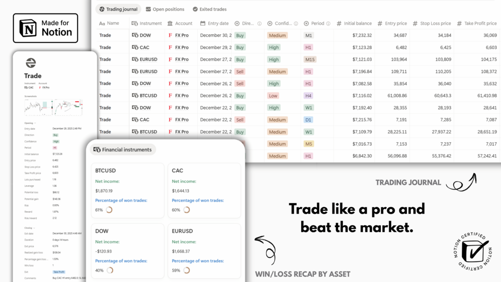 ✅ Use a trading journal to track your buying and selling of financial assets, including a win/loss recap and winrate analysis.