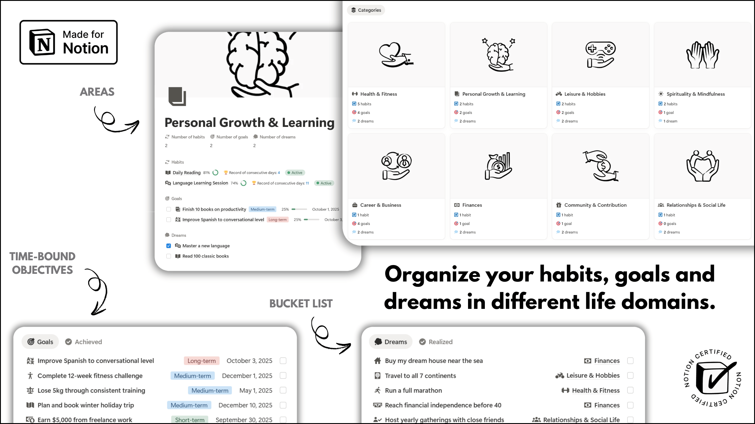 ✅ Organize and manage your habits, goals and dreams in different areas of your life.
