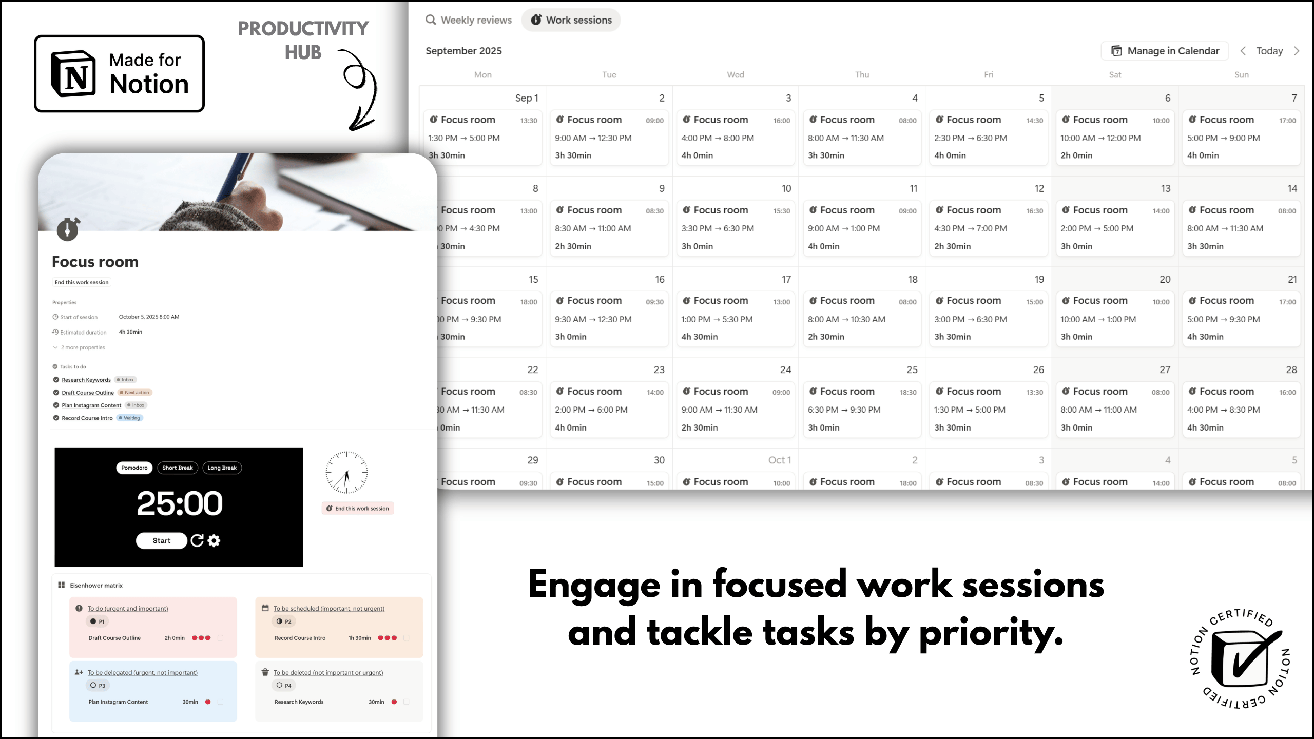 ✅ Structure focused work time with productivity tools tools to manage your time and task priorization: built-in clock and timer, Pomodoro, Eisenhower matrix...